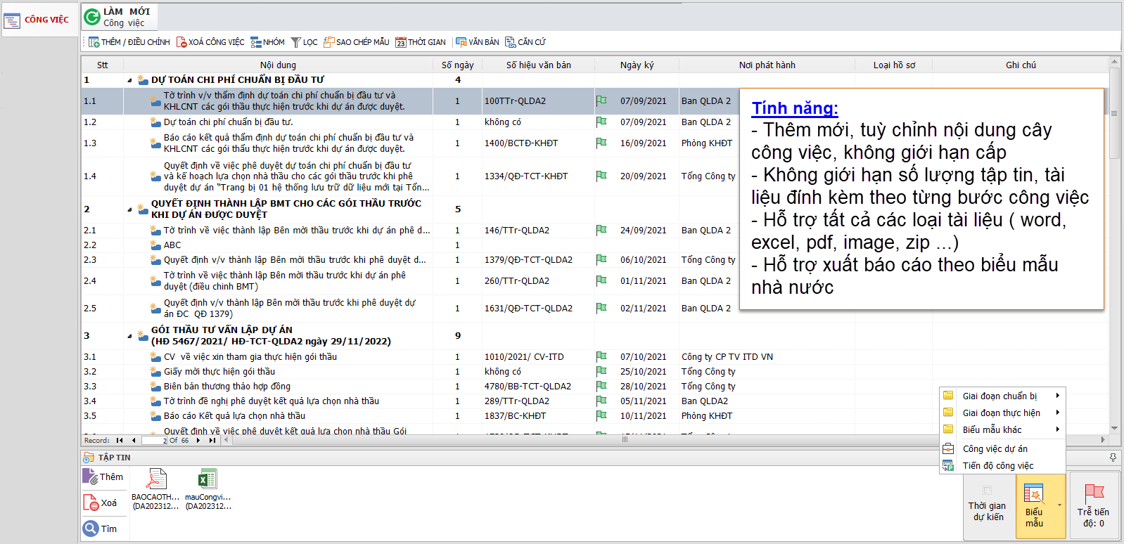 • Phần mềm hỗ trợ nhiều loại tập tin như Word, Excel, PDF, hình ảnh, giúp người dùng dễ dàng đính kèm và quản lý các tài liệu liên quan một cách toàn diện.